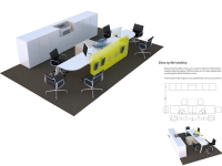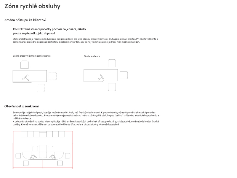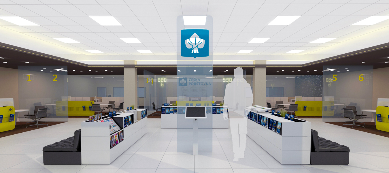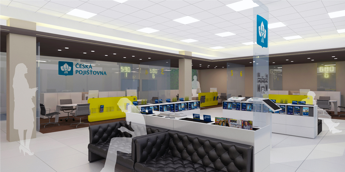 Jako hlavní výzvu ale chápeme zhmotnění hodnot, které v našem prostředí Česká pojišťovna představuje a chce v budoucnu představovat. Je to zejména domácí tradice, která se v žádném případě nesmí zaměňovat za zkostnatělost, ale naopak tradice, která dodá jistotu podané pomocné ruce. Design interiéru musí podporovat samostatnost, klient se sám rozhoduje, nikdo a nic ho k ničemu nenutí. Proto by každá pobočka měla mít několik zón lišících se mírou pozornosti pracovníků ČP - od nezávazného zázemí pro přečtení novin po samostatné vyřízení pojistné události, konzultaci s odborníkem/technikem/obchodníkem, až po projednání citlivých záležitostí v diskrétní zóně. Vše s důrazem na partnerský vztah klient-pracovník ČP.