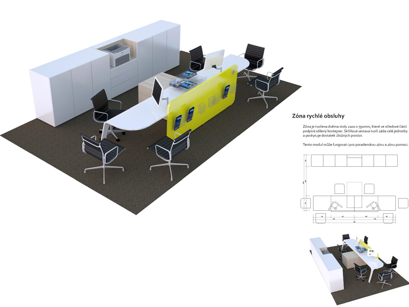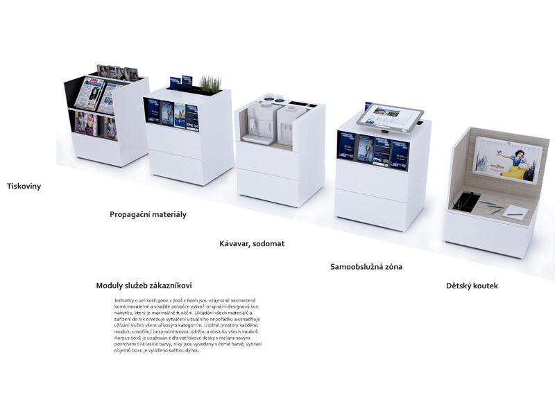 Při vytváření nového konceptu poboček České pojišťovny jsme vzali v úvahu hlavní body zadání: modularitu, zaměření na detail, autenticitu a odlišení od konkurence. Stejně tak jsme respektovali požadavek na maximální flexibilitu, snadnou orientaci, jednoduchost, otevřenost, férovost a rychlost.